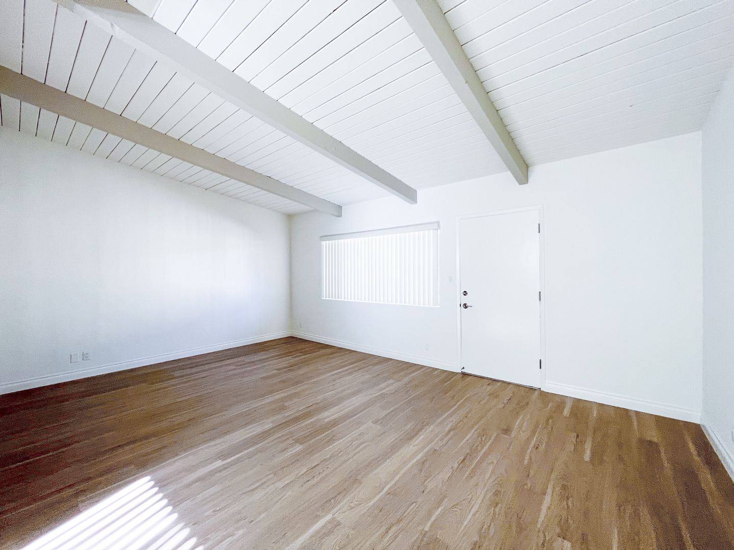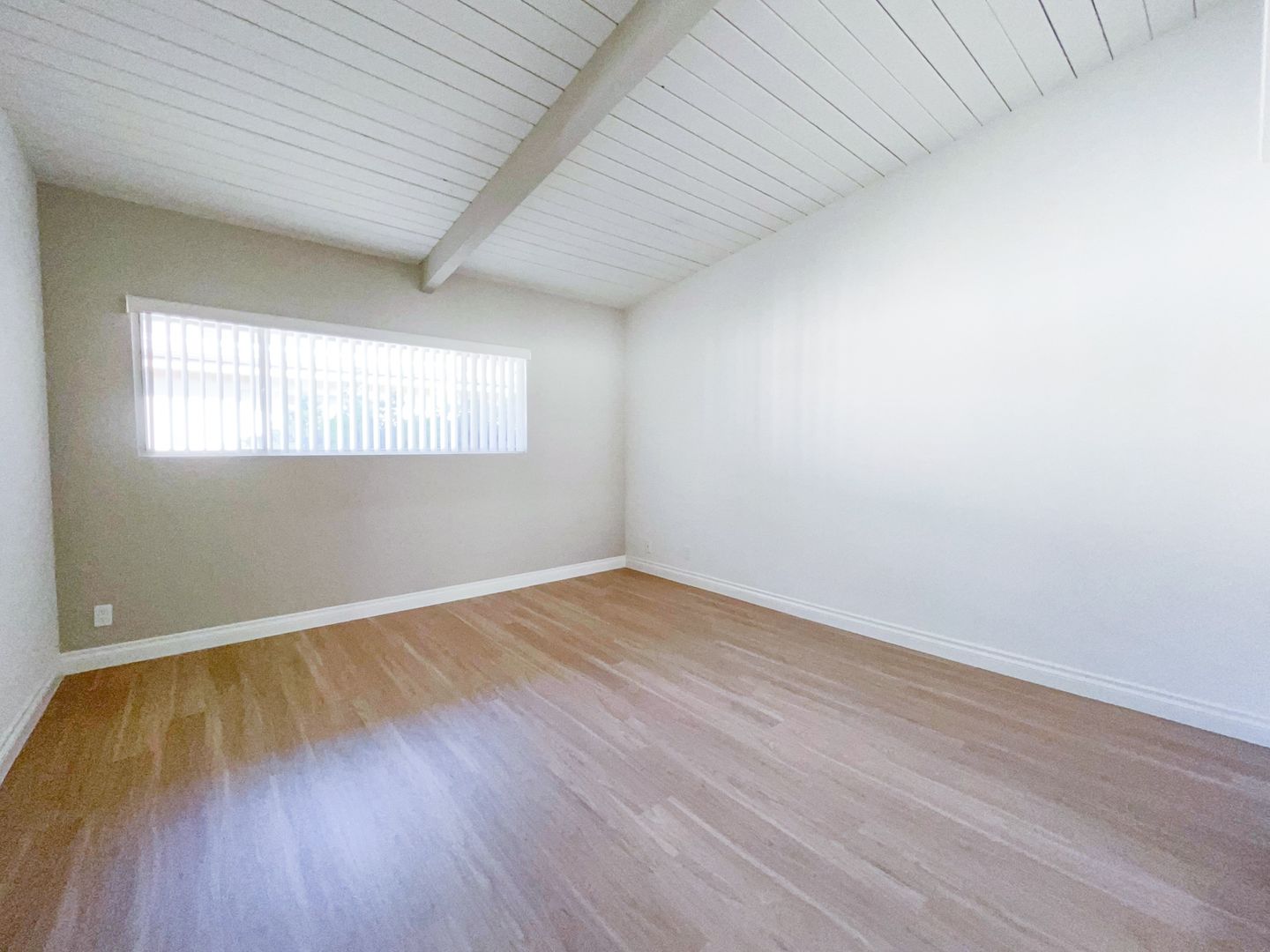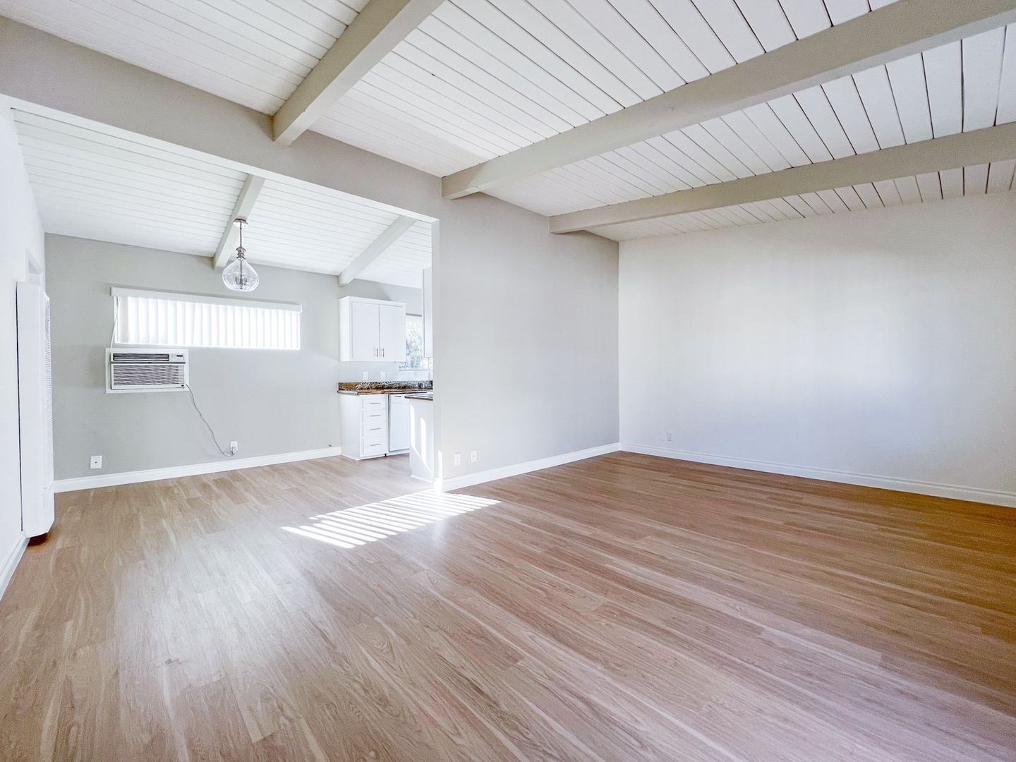 Unique top floor 680 sq. ft. 1 bedroom 1 bath has dramatic vaulted ceilings and large windows on both sides to allow the most amount of natural light and cross breeze. The open-concept floor plan features laminate flooring throughout. The spacious living room, shared with the dining area, flows into a newly upgraded kitchen. This kitchen truly glows with brand-new quartz countertops, NEW stainless-steel appliances, and track lighting. A kitchen window offers plenty of natural light and a green view of the trees. For your comfort, a wall-mounted A/C unit is also included. As you enter the hallway, you'll find floor-to-ceiling linen cabinets, providing essential additional storage. The spacious bedroom also features vaulted ceilings, double-door mirrored closets, and custom windows for plenty of light. The bathroom has been newly renovated with NEW custom quartz tile in the bath/tub combination, NEW glass shower doors, a NEW vanity with a quartz counter, and a designer mirror. Don't miss the opportunity to see this exceptional apartment home!