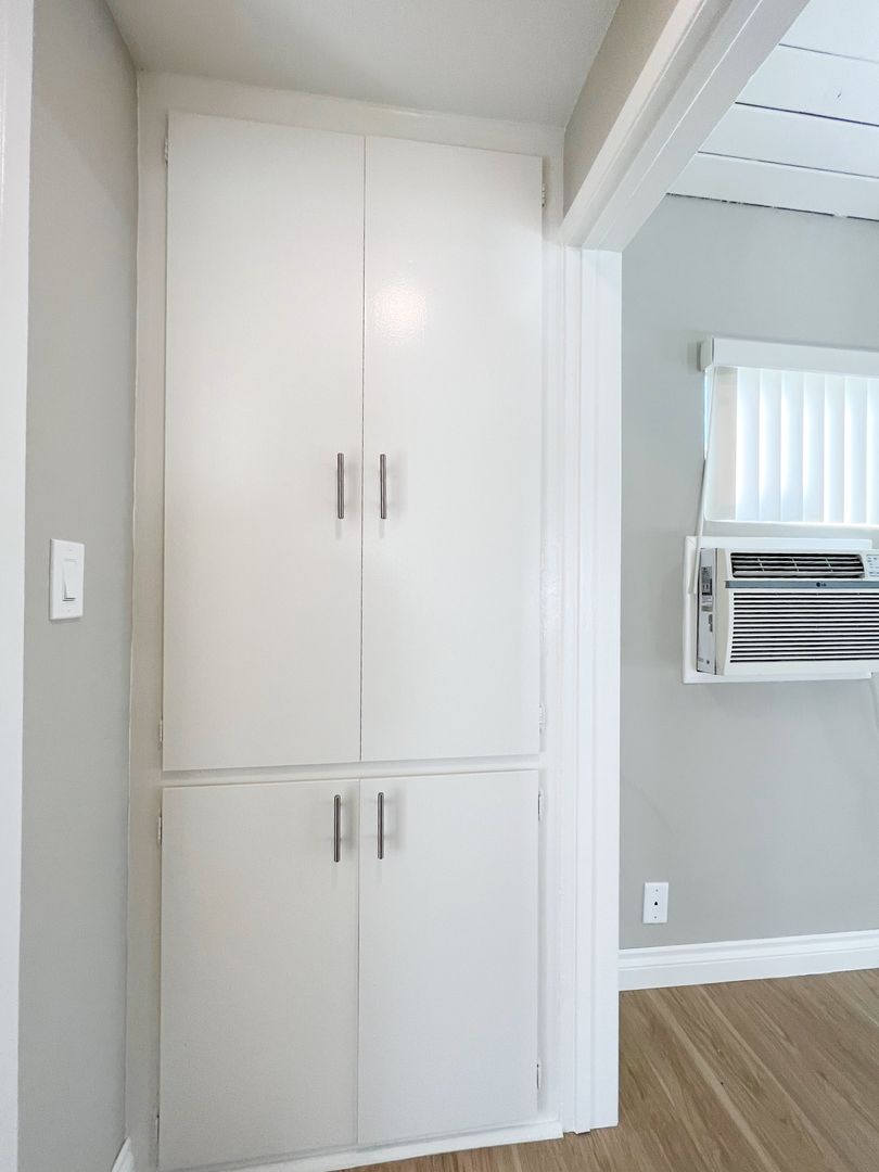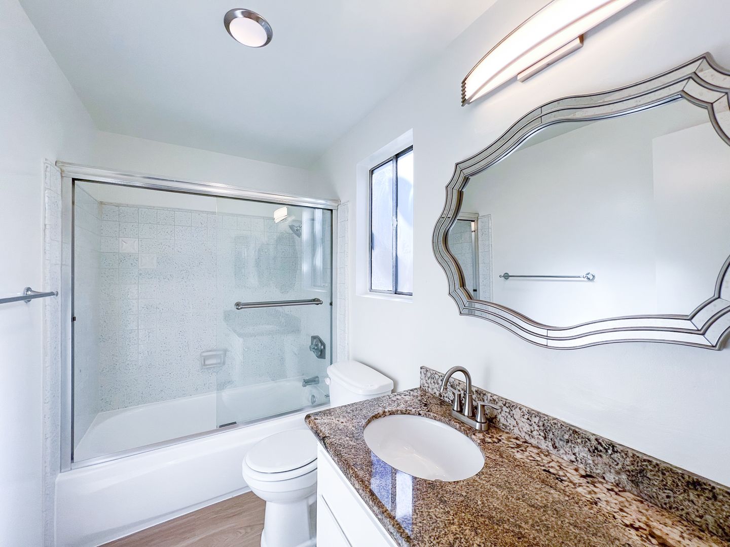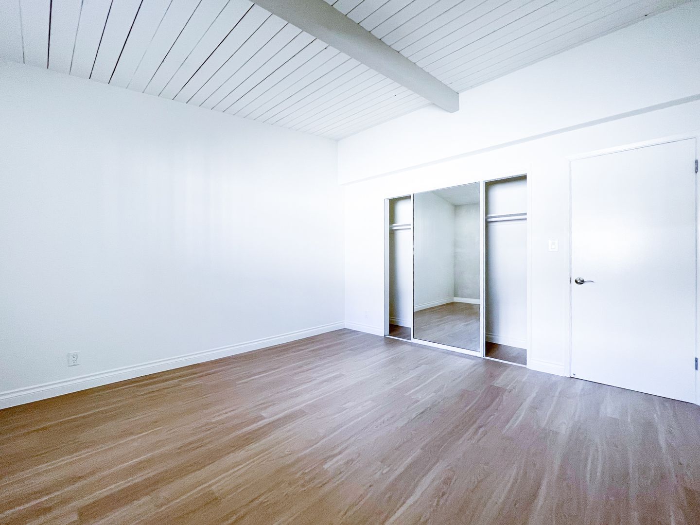 Unique top floor 680 sq. ft. 1 bedroom 1 bath has dramatic vaulted ceilings and large windows on both sides to allow the most amount of natural light and cross breeze. The open-concept floor plan features laminate flooring throughout. The spacious living room, shared with the dining area, flows into a newly upgraded kitchen. This kitchen truly glows with brand-new quartz countertops, NEW stainless-steel appliances, and track lighting. A kitchen window offers plenty of natural light and a green view of the trees. For your comfort, a wall-mounted A/C unit is also included. As you enter the hallway, you'll find floor-to-ceiling linen cabinets, providing essential additional storage. The spacious bedroom also features vaulted ceilings, double-door mirrored closets, and custom windows for plenty of light. The bathroom has been newly renovated with NEW custom quartz tile in the bath/tub combination, NEW glass shower doors, a NEW vanity with a quartz counter, and a designer mirror. Don't miss the opportunity to see this exceptional apartment home!