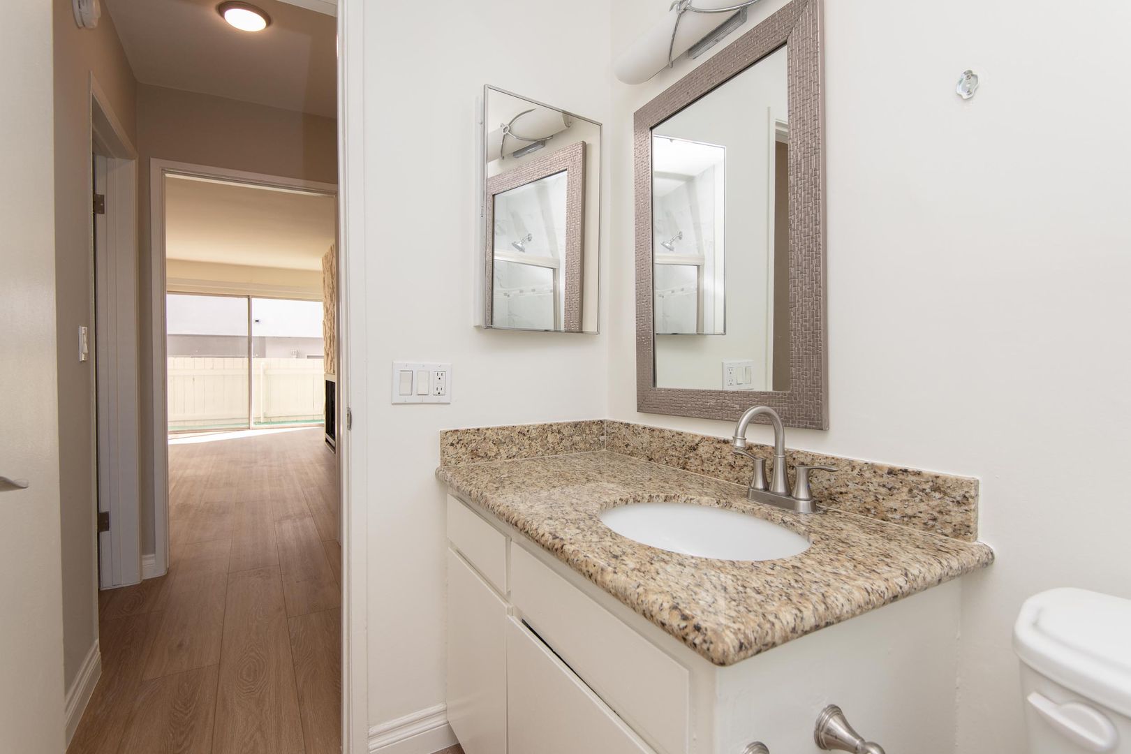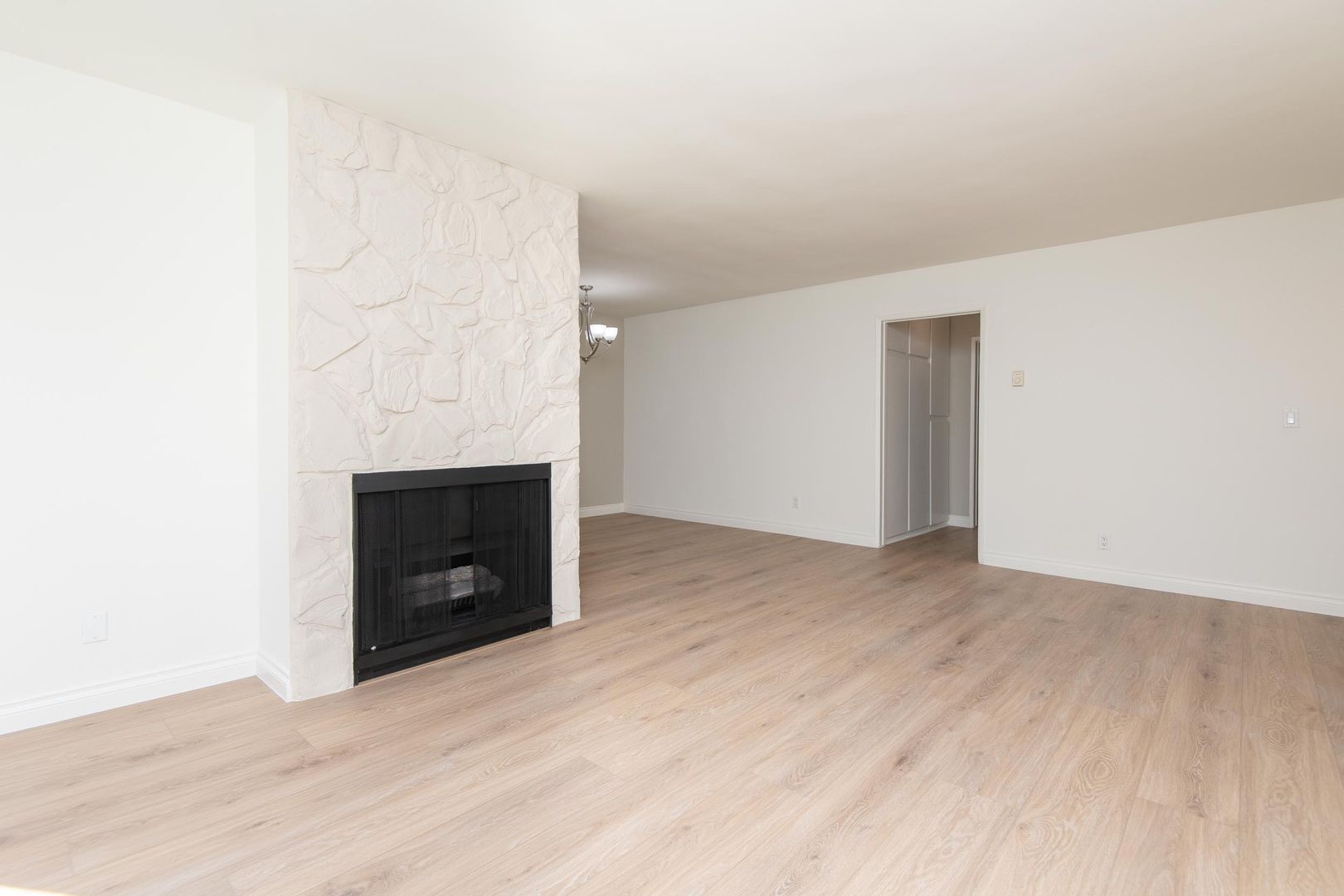 This bright 700 sq. ft. 1 bed 1 bath apartment home features NEW laminate flooring, stunning stone gas fireplace, and custom accent walls. The spacious living room and dining room have an open floor plan with sliding glass doors that lead onto a huge 110 sq. ft. private balcony. The large dining area has a wall A/C that cools the area. The modern kitchen has granite countertops with stainless steel appliances complemented by ample cabinetry and ceramic tile flooring with access to the private balcony. There is also a floor to ceiling wall of cabinet storage in the hallway. The nice size bedroom has wall-to-wall mirrored closet doors. The modern bathroom has a granite countertop, ceramic tile floors, designer mirror, and tub/shower combo. Don't miss out on this hidden gem, a great place to call home!