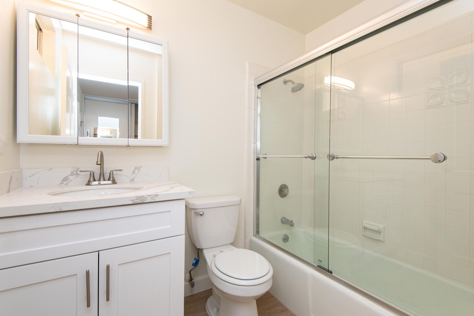 This first floor studio is 375 sq. ft. and has been completely renovated with laminate floors, custom accent walls, fully remodeled kitchen with a bright open living area that fits a full living and bedroom set. The modern kitchen has stainless steel appliances, complimented by quartz countertops and custom cabinets with a soft close feature. The bright and open living space has 2 picture windows that brings in plenty of natural light. The wall A/C and heat pump will heat and cool the entire apartment! There is spacious wall to wall closets for your wardrobe and storage needs. The updated bathroom has quartz countertop, quartz custom tile, glass shower doors and designer mirror! This unit provides luxury and economy in a highly desirable neighborhood.