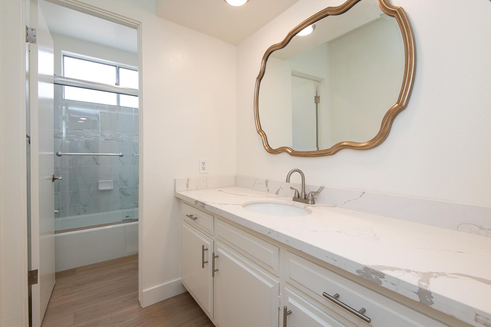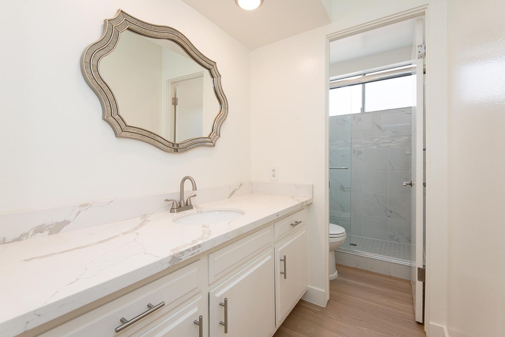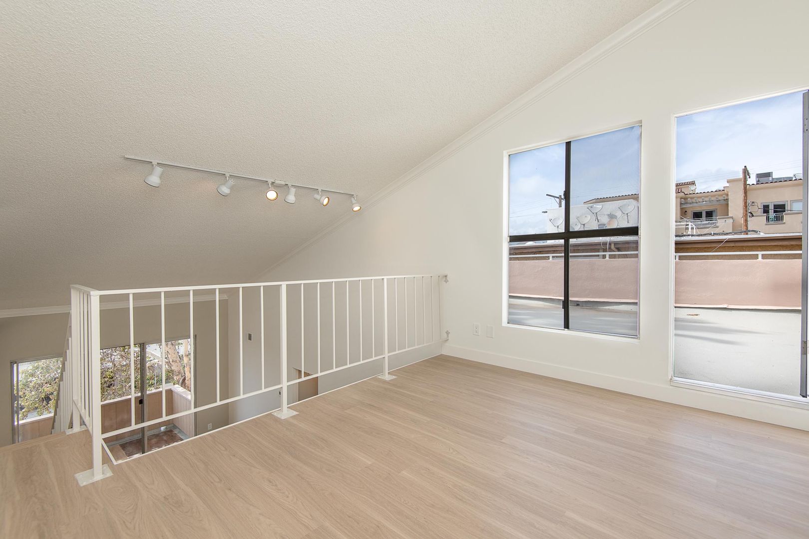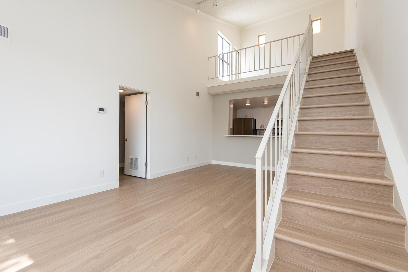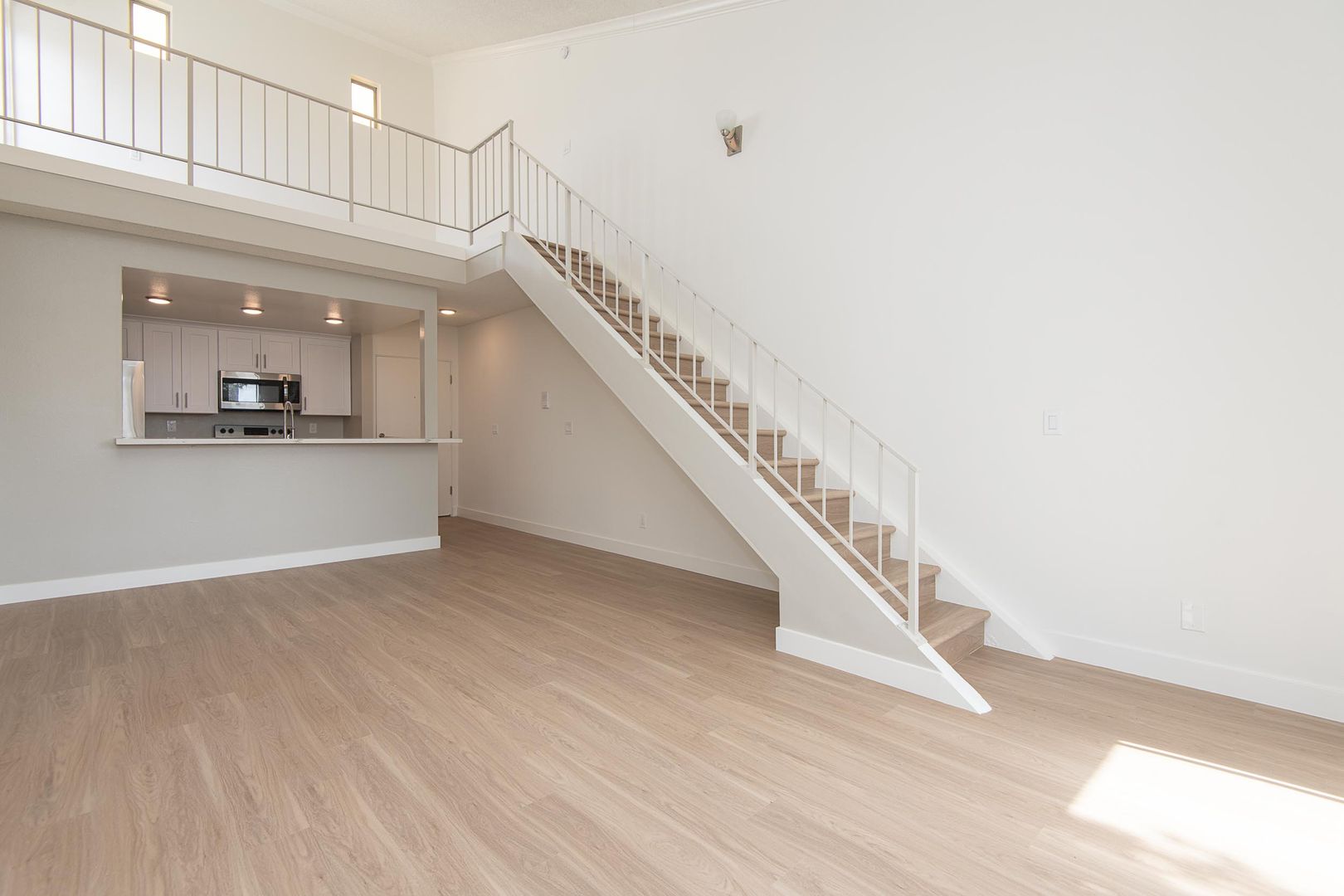 Beautiful and modern 2 bedroom 2 bath with an expansive upstairs LOFT! This huge 2 level apartment home boasts 1,150 sq. ft. and comes with all the modern amenities. Upon entering, you will see and feel the height of the vaulted ceilings that bring in tons of natural light. The designer kitchen features premium stainless steel appliances, custom cabinetry, quartz countertops and custom recessed lighting. The spacious living and dining room have an open floorplan with lots of design possibilities. There are also sliding glass doors that lead onto a private enclosed patio with unobstructed views. The central air and heating will help control the temperature year-round. As you go up to the stairwell from the living area, there is a large open loft area that is perfect for an office/guest room. The loft has private direct access to an amazing 420 sq. ft. rooftop deck that is big enough for a patio furniture and plants. Both bedrooms are located on the first level. The spacious sun filled primary suite has an attached private bathroom featuring custom tiled bathtub/shower combo, quartz countertops and designer mirror with large closets. The second bedroom is very spacious that has double mirrored closet doors. A full hallway bathroom includes a quartz tiled, full shower/bath combo, matching quartz vanity and a designer mirror. Don't miss out on this perfect home that is ideal for a family or roommates!