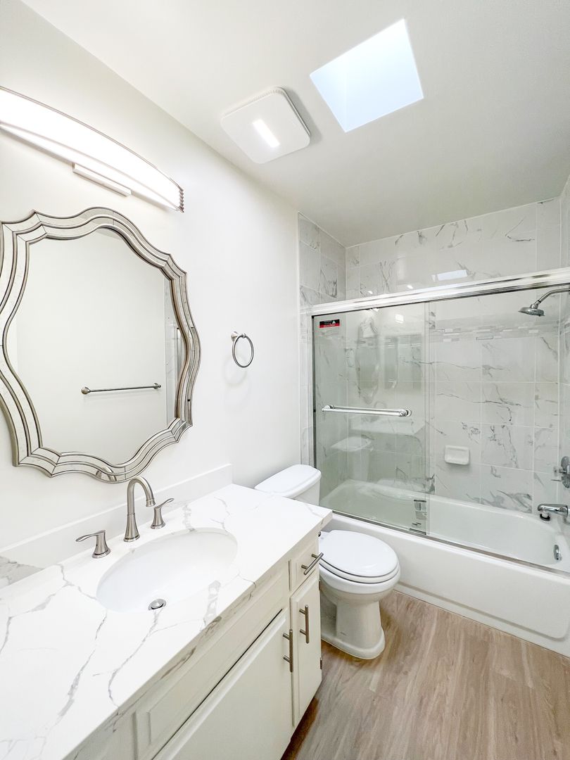 Gorgeous, Top floor 950 sq. ft. 2 bedroom 2 bath with an open concept floor plan, highlighted by laminate flooring and abundant natural light. The bright living and dining area flows onto a private balcony and includes a wall A/C unit for comfort. The designer kitchen features quartz countertops, custom cabinetry and is equipped with stainless steel appliances including a combo washer/dryer. The hallway has a skylight and there are additional cabinets for storage and a custom home feel. The spacious and equal-sized bedrooms can easily fit a bedroom set and both have wall-to-wall mirrored closet doors. The primary bedroom has an attached bath with quartz countertops, glass shower doors, quartz vanity and a skylight for great natural light. The hallway bath is also updated with quartz countertops, glass shower doors and designer mirror for a modern finish. A very special apartment home.