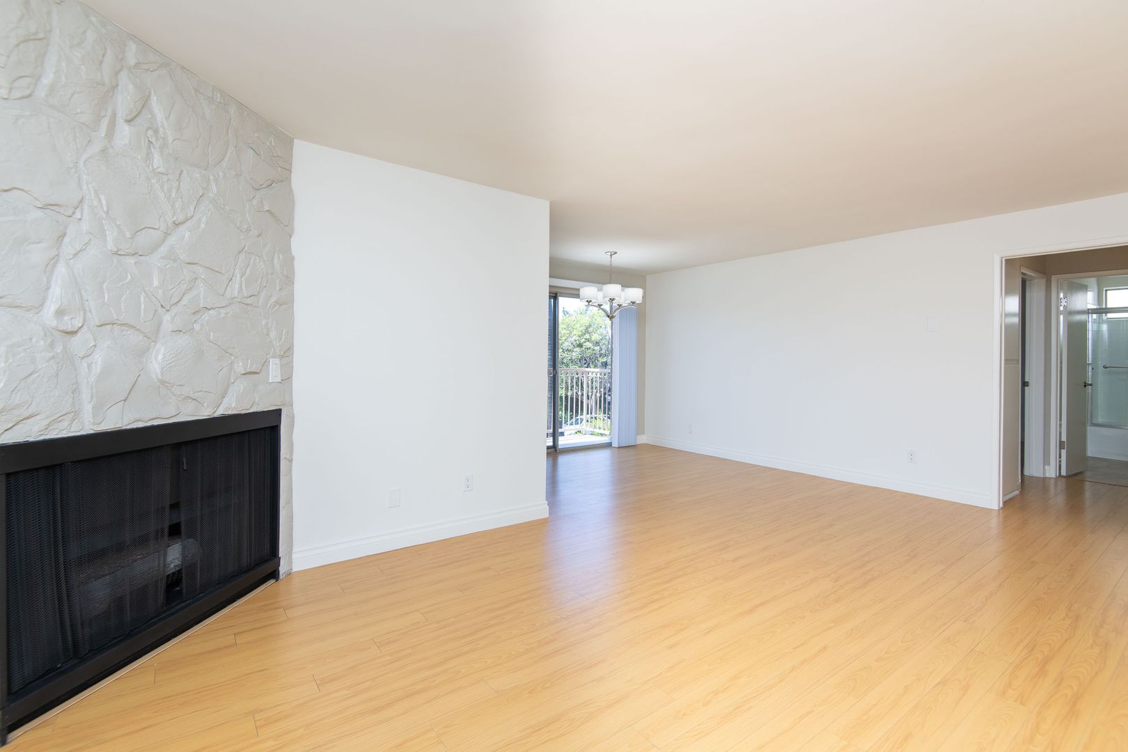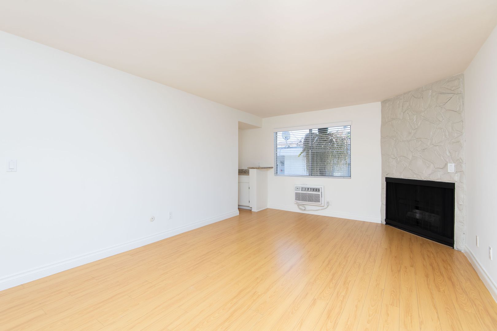 This remodeled upstairs 1 bedroom 1 bath apartment home faces West and includes: laminate flooring, custom accent walls and striking gas fireplace. The bright and open living and dining area allows entry to the large private balcony for plenty of natural light and can fit an outdoor set to enjoy the sunset views. The adjacent updated kitchen will includes a premium stainless steel appliances package, granite countertops, ceramic tile flooring and has a large window for more natural light. The spacious living room includes a wall A/C and a gas fireplace with adjoined dining area for a table set. The hallway features; floor to ceiling, additional closet space which is a welcome addition in any home. The spacious bedroom has a 4 pane window and double mirrored closet doors for your wardrobe. The modern bathroom includes granite countertops and full tub/shower combo. Don't miss out on this great apartment in ideal location.
