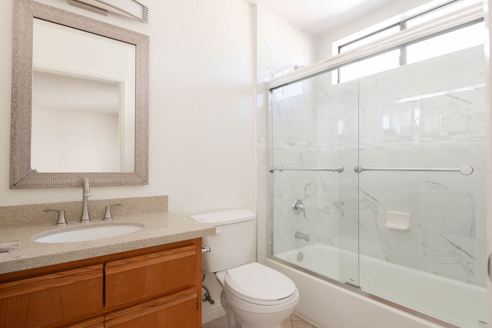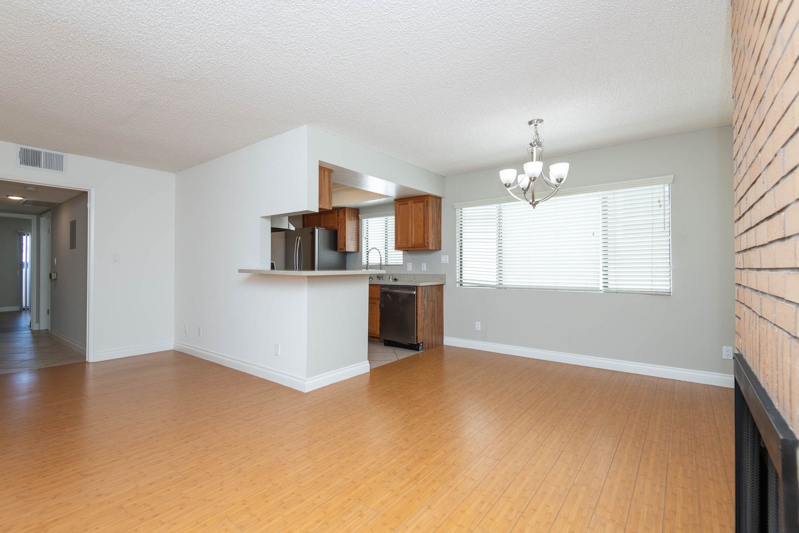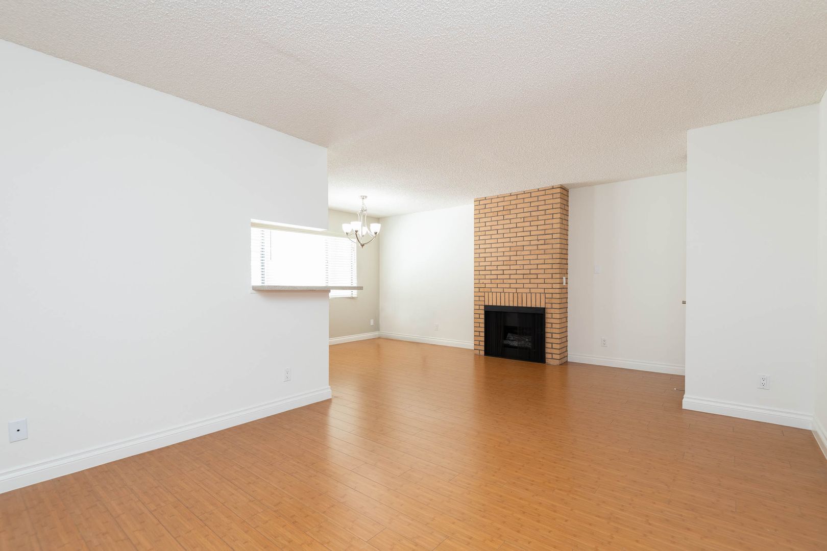 This spacious 900 sq. ft. 2 bedroom 2 bath apartment home has been fully renovated with laminate flooring, central air & heat, custom accent walls and a wall of windows for lots of natural light. The open and large living area has a gas fireplace that brings warmth into the room. The kitchen is equipped with upgraded stainless steel appliance package with a stunning inset ceiling and quartz countertop and a window for additional light. The separate dining area has a modern chandelier that adds a touch of sophistication. There is a huge walk-in closet in the hallway for needed storage space. Rest and recharge in the primary bedroom with a large walk-in closet and sliding glass doors onto your private balcony. There is also a full bath attached with quartz countertop, ceramic tile flooring and quartz tiled bathtub/shower combo with glass shower doors. The other bedroom is also nice size and has wall to wall double mirrored closet doors with built-in cabinetry. This room is perfect for a home office or guest bedroom. The 2nd hallway bathroom has a quartz countertop and matching quartz tiles full shower/tub with glass doors. Great floor plan for a family or roommates.