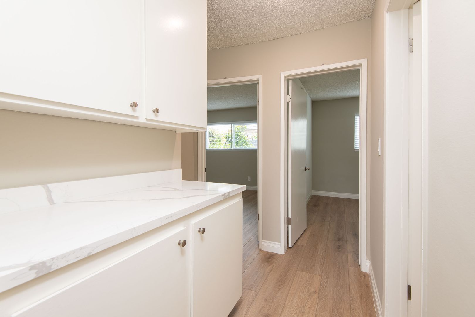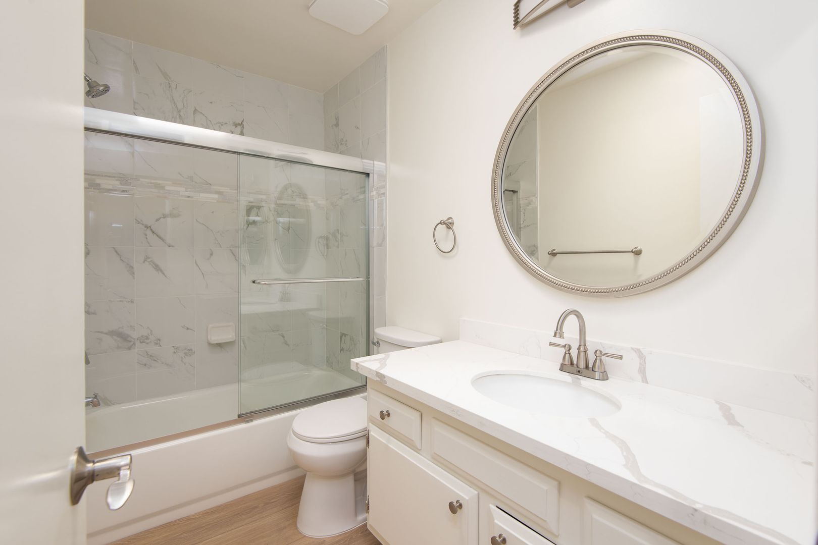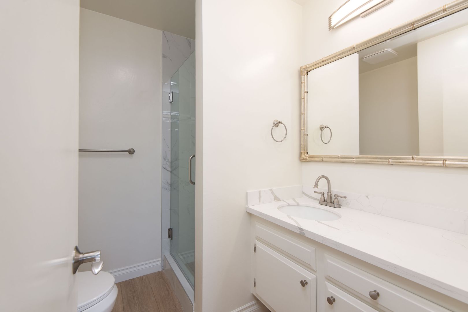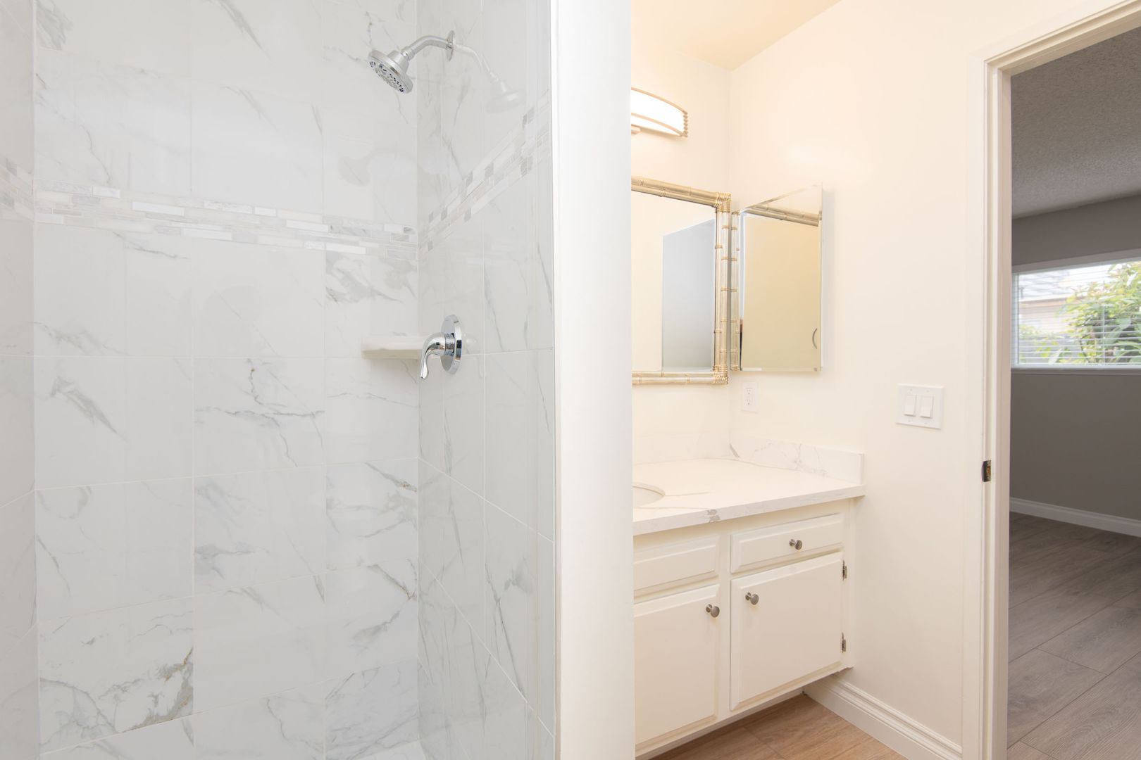 Gorgeous and newly remodeled 2 bedroom 2 has all the amenities you desire and boasts 920 sq. ft. of living space. The open and spacious floorplan has NEW laminate flooring throughout. The living room has a cozy gas fireplace with custom accent walls and a NEW wall heat pump that will keep the temperature perfect. The sliding doors lead onto a 65 sq. ft. private balcony for outdoor furniture and plants. Adjacent to the dining area is the NEWLY updated kitchen that is equipped with NEW quartz countertops, NEW stainless-steel appliances and ample cabinetry. The full hallway bathroom has a modern look with NEW quartz countertop, framed decorative mirror, and a full tub/shower with NEW quartz custom tile and NEW glass shower doors. The primary bedroom is very spacious and bright with a large window for plenty of natural light and a walk-in closet with built-in shelving. The attached bath has a NEW quartz countertop, and a spa inspired shower with NEW glass doors and a decorative mirror. The 2nd bedroom is also spacious, with a large window, mirrored closet doors and can easily fit a queen bedroom set. The hallway also has additional storage with a matching, NEW quartz countertop for a designer look. Stylist apartment home that will rent fast! Schedule a viewing today!